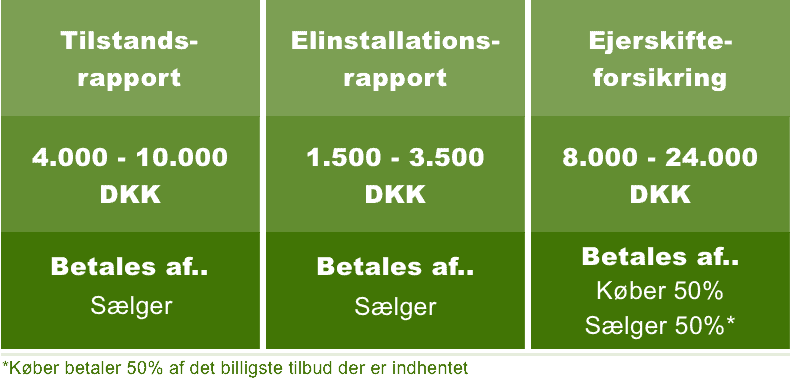 En ejerskifteforsikring koster typisk i omegnen af 8.000–24.000 DKK i forsikringspræmie. For at lave en ejerskifteforsikring, er det dog en forudsætning, at sælger af boligen fået en sagkyndig til at lave en elinstallations- og tilstandsrapport, da prisen er baseret på rapporternes vurdering af ejendommen stand, størrelse, beliggenhed og ejendomsværdi. En tilstandsrapport koster typisk i omegnen af 4.000–10.000 DKK og en elinstallationsrapport koster typisk omkring 1.500–3.500 DKK, alt efter størrelsen på boligen.